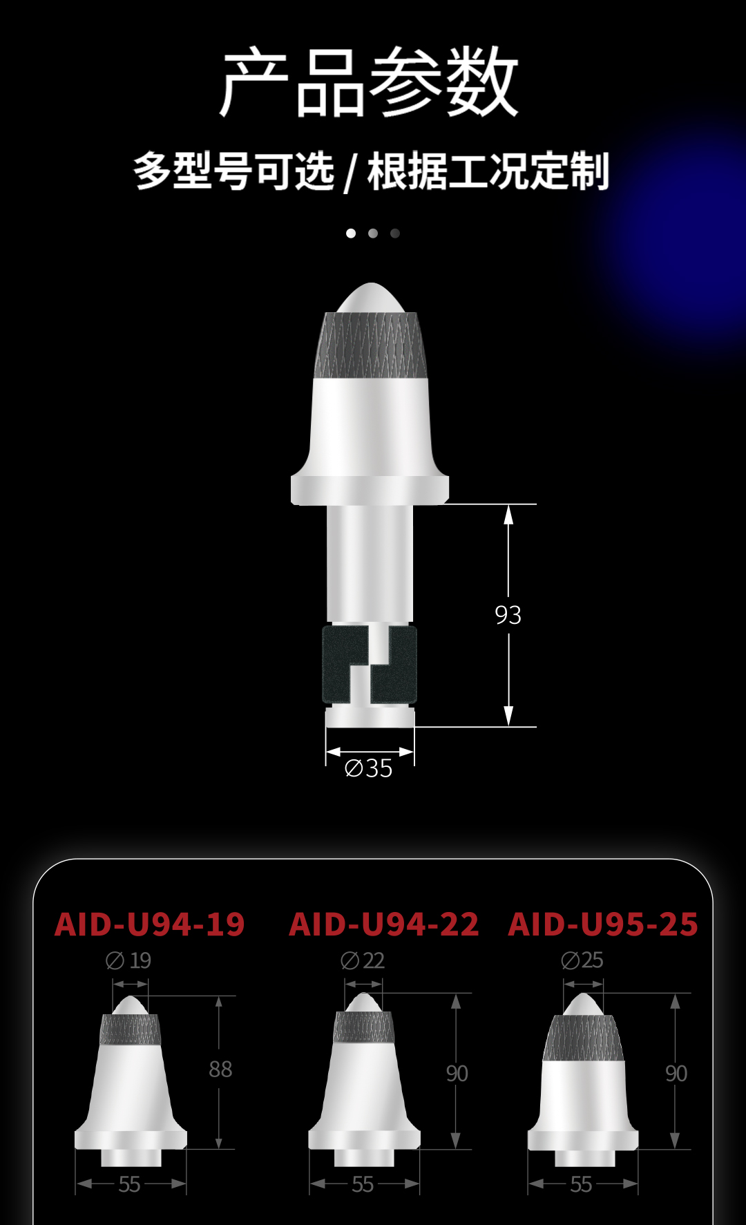 产品特性: U90系列采煤机截齿适用于中、大型功率采煤机;加宽齿肩,更好的保护齿座、齿套;主体抗磨损强,抗高温火花、更换速度快;宽大截齿头部,提高抗冲击负荷;硬质合金选配范围16mm~35mm。