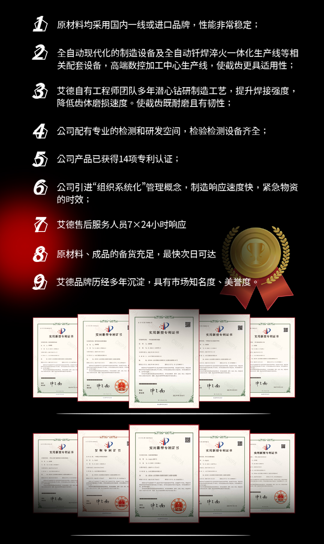 产品材质:钨钴硬质合金(合金头); 碳化钨,硬质合金冶金复合材料(耐磨层); 42Crmo合金钢(齿体)