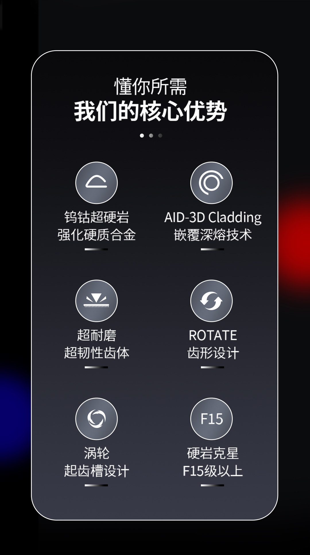 产品材质:钨钴硬质合金(合金头); 碳化钨,硬质合金冶金复合材料(耐磨层); 42Crmo合金钢(齿体)