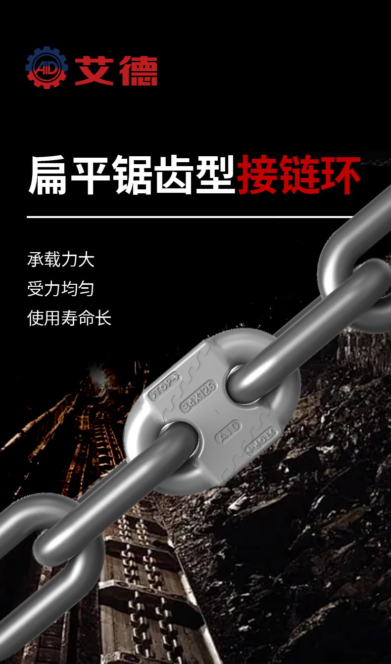 产品特性: 扁平弧齿型接链环通过采用优质54合金钢材质,使用智能加工中心生产,经过自主研发热处理工艺等,让接链环具有高强度、高韧性、耐磨损、耐腐蚀、良好的冷弯能力、较高的破断拉力等综合机械性能。