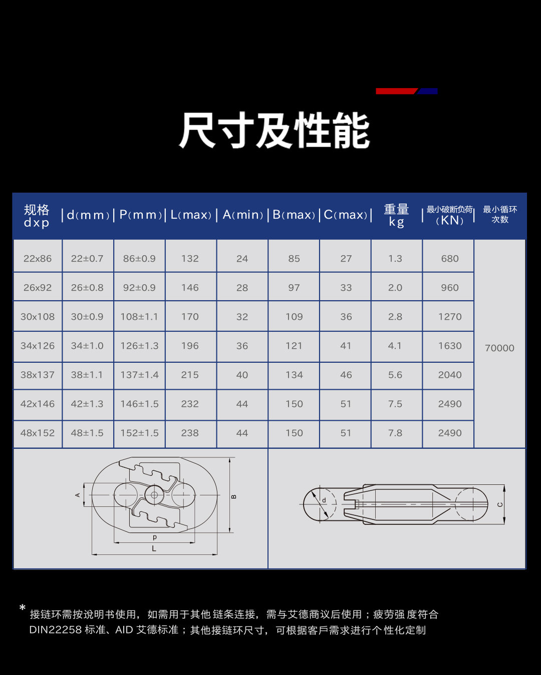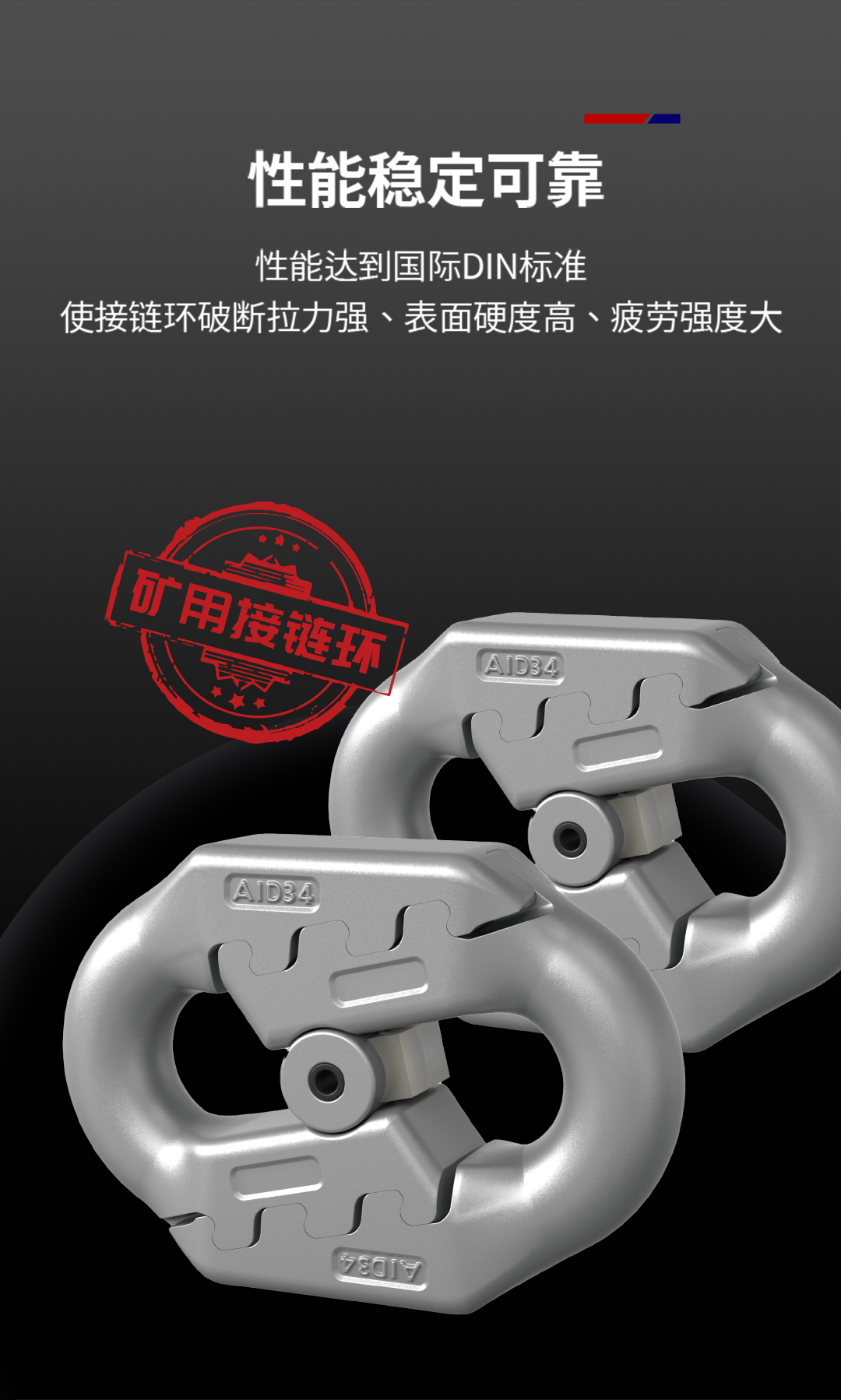 产品特性: 扁平弧齿型接链环通过采用优质54合金钢材质,使用智能加工中心生产,经过自主研发热处理工艺等,让接链环具有高强度、高韧性、耐磨损、耐腐蚀、良好的冷弯能力、较高的破断拉力等综合机械性能。